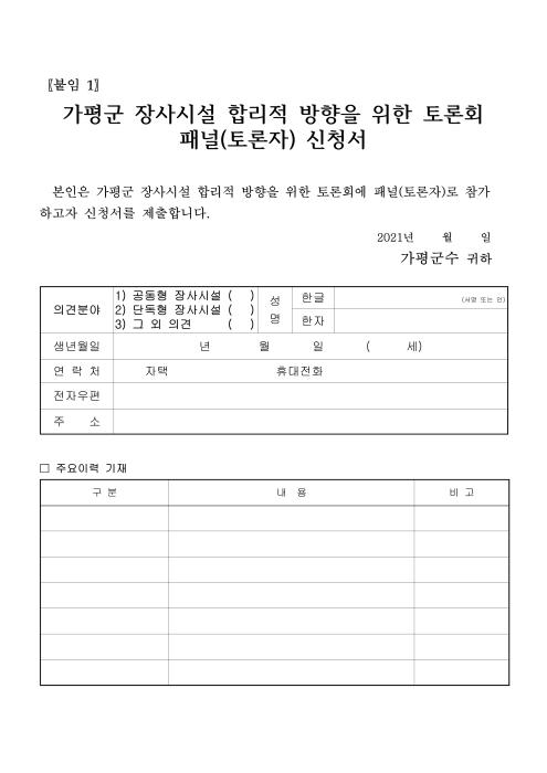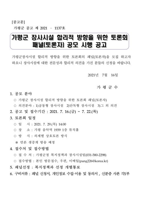 공모 분야는 가평군 장사시설 합리적 방향을 위한 토론회 패널(토론자)로 의견분야는 1)공동형 장사시설 2)단독형 장사시설 3)그 외 의견 등이며, 공고 및 접수기간 : 2021. 7. 16.(금) ~ 7. 22.(목)로 가평군청 복지정책과 장사시설팀(031-580-2298)에 본인 방문접수, 우편, 이메일((pang226@korea.kr) 신청이 할 수 있다.