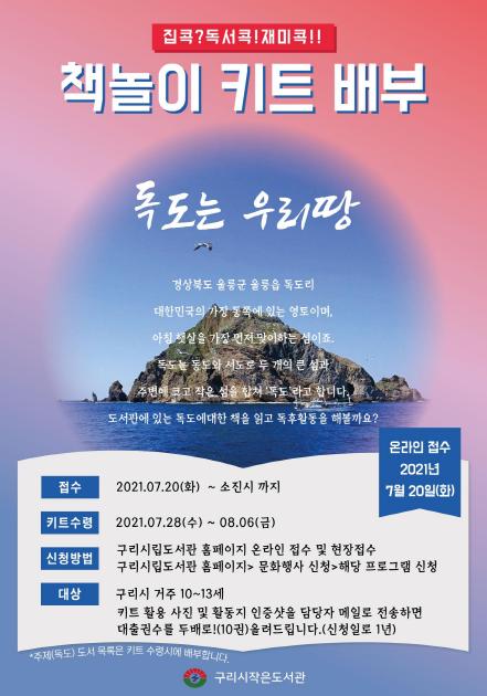 [한국뉴스타임=명기자] 구리시 작은도서관은 시에 거주하는 10세에서 13시까지 아동 각 12명씩 총 60명에게 7월 20일부터‘독도는 우리땅’이라는 주제로 책놀이 키트를 선착순 무료 배부한다.