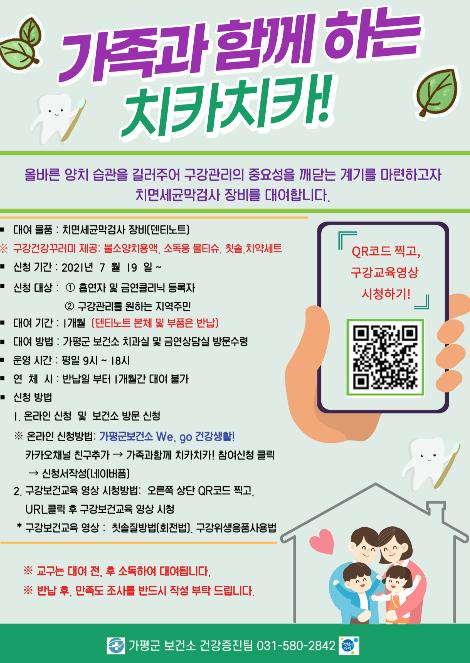 박정연 가평군 보건소장은 “예로부터 오복(五福)중 하나로 여긴 건강한 치아를 유지하기 위해 집에서 간편하게 입 속 세균을 확인 할 수 있고, 건강하게 구강위생을 관리할 수 있도록 치면세균막 검사 장비(덴티노트) 대여에 많은 군민들의 참여를 바란다” 라고 말했다.
