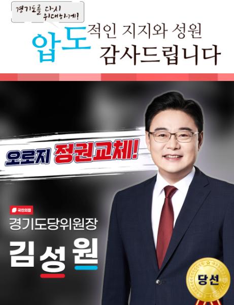 김 의원은 “국민을 불행하게 만드는 오만한 권력은 반드시 쓰러진다는 역사적 교훈을 후대에 남겨줘야 한다”며, “당원 여러분과 경기도민 여러분께서 부여해주신 정권교체라는 소명, 반드시 이뤄내겠다”고 당선 소감을 밝혔다.
