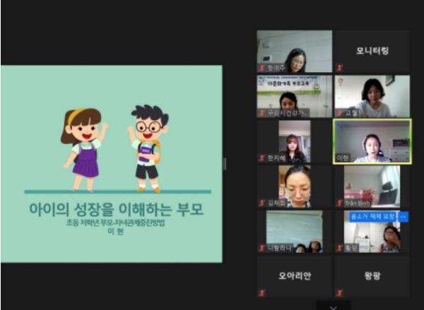 이번 교육은 총 4회기의 다문화가족 부모교육 중 세 번째 교육으로,‘초등 저학년 부모-자녀 관계증진’을 주제로 보아스 아동·청소년 심리상담센터의 이현 부소장을 강사로 초청하여 실시간으로 강사와 교육대상자가 양방향 소통과 질의 응답하는 시간을 가졌다.
