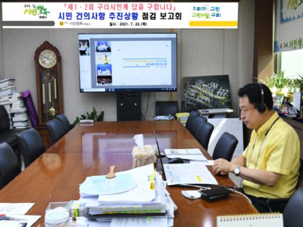[한국뉴스타임=명기자] 구리시는 22일 실무 담당 공무원 54명이 참가한 가운데「구리시민께 답을 구합니다」시민 건의 사항 추진상황을 온라인 화상회의로 점검하는 시간을 가졌다.