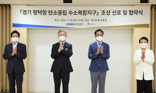 이재명 경기도지사와 정장선 평택시장, 조명래·강금실 경기도 기후대응·산업전환공동위원장은 26일 경기도청에서 20개 공공기관 및 민간기업과 함께 ‘경기 평택 수소특화단지 구축을 위한 투자협약’과 ‘경기 평택 수소기반 탄소중립항만 조성을 위한 업무협약’을 체결했다.
