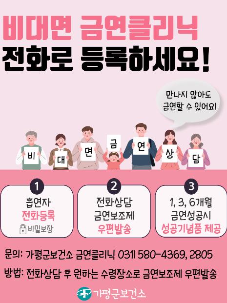[한국뉴스타임=명기자] 가평군보건소는 코로나 19의 확산으로 거리두기가 연장됨에 따라 감염 확산 방지 및 군민의 금연 성공을 돕기 위하여 비대면 금연클리닉을 운영하고 있다.