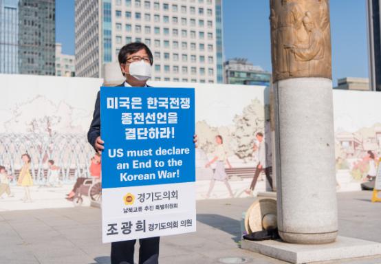 [한국뉴스타임=명기자] 경기도의회 남북교류추진 특별위원회(위원장 염종현 의원) 조광희 의원(더불어민주당, 안양5)이 27일 미국 대사관 앞에서 종전선언 촉구 1인 릴레이 시위에 참가했다.