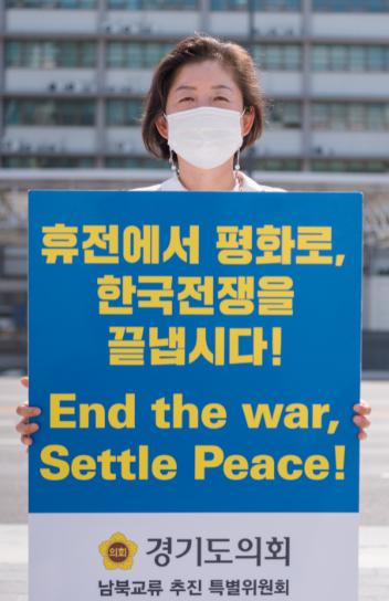 문경희 부의장은 ‘휴전에서 평화로, 한국전쟁을 끝냅시다!(End the war, Settle Peace!)’라는 문구가 담긴 팻말을 들고, “종전선언을 통해 오랜 시간 지속된 남북 간 적대관계를 청산하고, 항구적인 한반도 평화체제 구축을 통해 새로운 화합과 평화의 시대를 함께 가길 희망한다.”고 말했다.