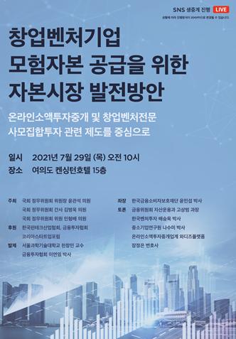 김병욱 의원은 “자본시장에서 정하고 있는 온라인소액투자중개업 및 창업벤처전문 PEF 제도 기타 모험자본 공급 활성화 목적으로 논의되고 있는 제도들에 대하여 기존 상장사 중심의 자본시장 제도적 논의에서 벗어나 비상장 중소기업들의 원활한 자금조달에 필요한 정책과 입법에 대한 구체적인 논의가 필요하다는 현장의 요구가 많다”며 토론회 개최 취지를 밝혔다.