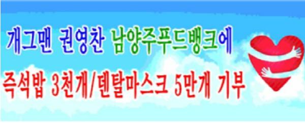 [한국뉴스타임=명기자] 남양주시는 대학교수, 학원 대표 등에 이어 최근에는 유튜브를 통해 활발한 활동을 펼치고 있는 개그맨 권영찬이 지난 23일 금곡동에 위치한 푸드뱅크에 즉석 밥 3천 개와 덴탈 마스크 5만 장을 후원했다고 밝혔다.