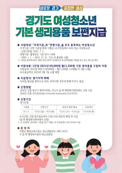 신청기간은 2021년 8월 1일부터 8월 31일까지로 총 31일간 신청 가능하며, 2021년 7월 1일 기준 가평군에 주민등록이 되어있는 만 11세 ~ 18세 여성청소년이라면 누구나 경기지역화폐 69,000원(월 11,500원, 7~12월분) 지원 받을 수 있다.