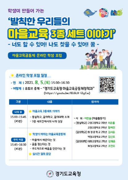 포럼은 ▲마을교육 3종 세트(몽실학교·경기꿈의학교·경기꿈의대학) 소개 영상 및 참여 경험 공유, ▲마을 안에서의 배움, ▲주도적 배움의 중요성 등을 주제로 진행되며, 경기도교육청 마을교육공동체정책과 유튜브 채널에서 시청할 수 있다.