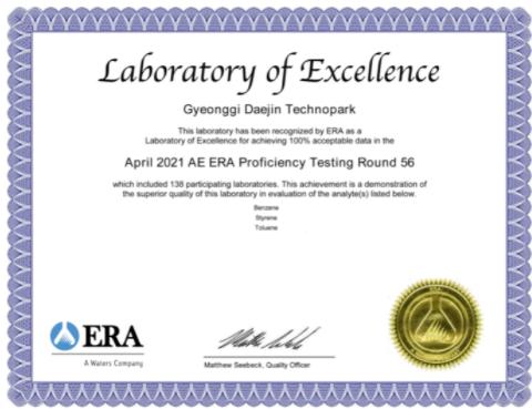 미국 환경자원협회(ERA)는 국제표준화 기구(ISO)에서 ISO/IEC 17043 (적합성 평가) 인증을 받은 국제숙련도 시험기관으로, 국제숙련도시험은 분석능력의 향상, 측정분석 결과의 정확성 및 신뢰도를 평가하기 위해 전 세계 시험분석기관이 참가하여 진행하고 있다.