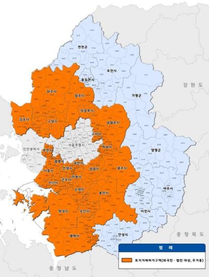 한편, 도는 지난해 10월 31일부터 연천군, 포천시, 동두천시, 가평군, 양평군, 여주시, 이천시, 안성시 등을 제외한 23개 시 전역 5,249.11㎢를 외국인·법인 토지거래허가구역으로 지정‧운영하고 있다. 도는 최초 6개월 지정 만료를 앞두고 지난 4월 재지정했고, 토지거래허가구역은 내년 4월 30일까지 유지된다.