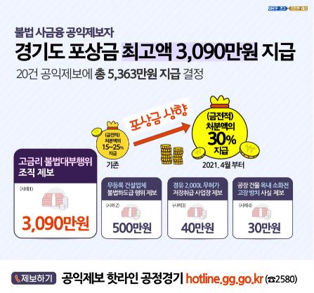도는 지난달 30일 2021년도 제4차 경기도 공익제보지원위원회를 열고 불법 사금융, 무등록 건설업자 불법 하도급, 소방시설 고장 방치 등을 제보한 공익제보 20건에 대해 포상금 5,363만 원을 지급하기로 결정했다.