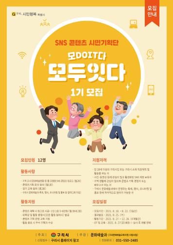 [한국뉴스타임=명기자] 구리시는 문화예술교육 활성화를 위해 다양한 콘텐츠 기획과 운영을 함께해 나갈 SNS 콘텐츠 시민기획단 ‘모DOIT다:모두잇다’ 1기를 모집한다.