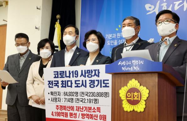 국민의힘 소속 의원들은 “이번 제3회 추경예산에는 전 도민에게 1인당 25만원씩 지급하는 재난기본소득 예산으로 4천190억 원, 지역화폐 발행 확대에 611억 원이 편성됐다”면서 “경영위기의 버스업계 등과 중소기업 소상공인 지원에는 370억 원, 재난 재해 예방을 위한 지방하천정비 사업에는 고작 66억 원을 편성했다”고 목소리를 높였다.