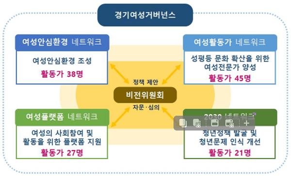 경기여성거버넌스의 4개 분야는 ▲여성 안심환경 네트워크(여성안심환경 조성) 38명 ▲여성활동가 네트워크(성평등 문화 확산을 위한 여성전문가 양성) 45명 ▲여성 플랫폼 네트워크(여성의 사회참여 및 활동을 위한 플랫폼 지원) 27명 ▲2030 네트워크(청년정책 발굴 및 청년문제 인식 개선) 21명 등이다.