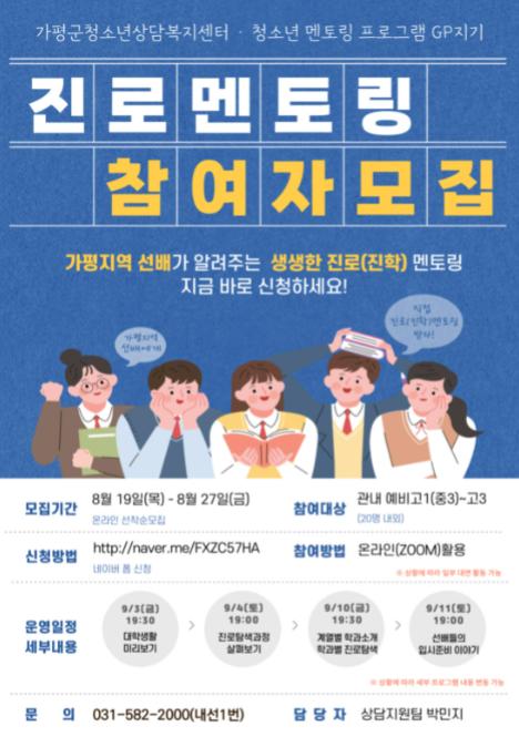 [한국뉴스타임=명기자] 가평군청소년상담복지센터는 관내 청소년들을 위한 대학생 선배와 함께하는 진로(진학) 멘토링 프로그램 ‘GP지기’를 운영한다고 밝혔다.