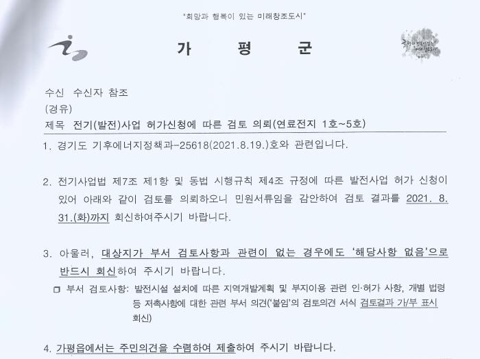 가평군청 일자리경제과는 경기도 기후에너지정책과 요청에 따라 ‘전기(발전)사업 허가신청에 따른 검토의뢰(연료전지 1회~5호)’ 대한 검토 요청서를 24일자 발송 한 상태이다.