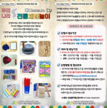 [한국뉴스타임=명기자] 포천시육아종합지원센터는 9월 16일부터 17일까지 ‘2021 추석맞이 제4회 전통놀이 한마당’ 행사를 비대면으로 개최한다.