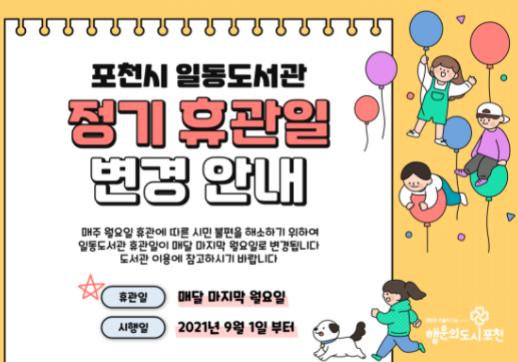 이에 포천시는 주민불편 해소를 위해 북부권역 도서관 중 가장 이용률이 높은 일동도서관의 정기 휴관일을 매주 월요일에서 매달 마지막 월요일로 변경한다고 밝혔다.