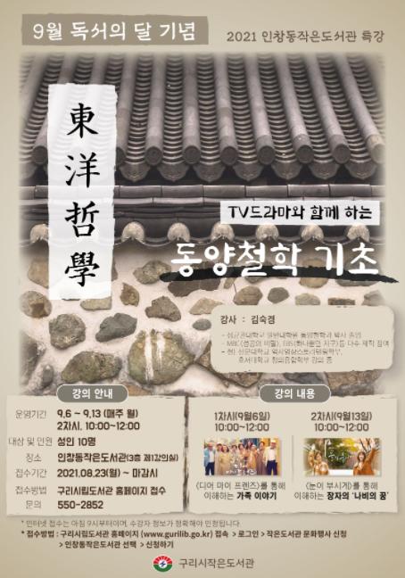 [한국뉴스타임=명기자] 구리시 작은도서관은 독서의 달 9월을 맞이하여, 동양철학을 주제로 ‘TV드라마와 함께 하는 동양철학 기초’ 인문학 특강을 운영한다.