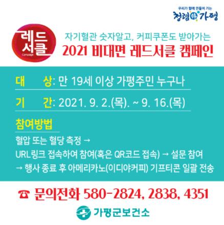 [한국뉴스타임=명기자] 가평군 보건소에서는 심뇌혈관질환 예방관리주간을 맞아 9. 2. ~ 9. 16.까지 15일간 비대면 레드서클 캠페인을 실시한다.