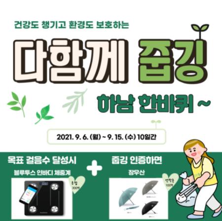 [한국뉴스타임=명기자] 하남시는 코로나19 장기화에 따른 신체활동 감소와 최근 쓰레기로 인한 환경파괴 우려가 높아짐에 따라 9월 6일부터 15일까지 ‘다함께 줍깅~ 하남 한바퀴’ 걷기 챌린지를 실시한다고 3일 밝혔다.