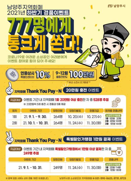[한국뉴스타임=명기자] 남양주시가 9월부터 10월까지 코로나19로 경제적 어려움에 있는 골목상권을 응원하고자 지역화폐 인센티브 월 지급한도 100만원 상향과 동시에 남양주지역화폐(Thank You Pay-N) ‘777명에게 통크게 쏜다!’ 경품 이벤트를 진행한다고 밝혔다.