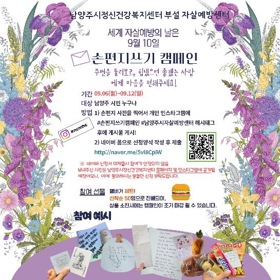 [한국뉴스타임=명기자] 남양주시는 9월 10일 ‘세계 자살 예방의 날’을 맞아 6일부터 오는 12일까지 일주일 동안 자살 예방 주간 캠페인 ‘손 편지 쓰기’를 온라인으로 진행한다.