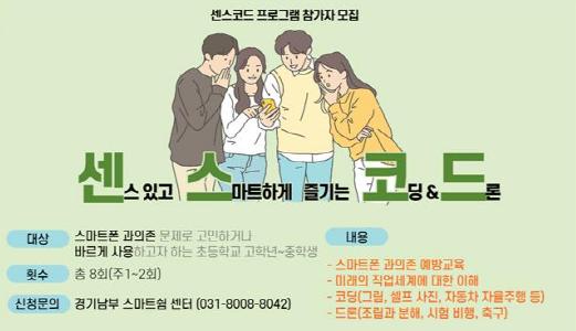 [한국뉴스타임=명기자] 경기도가 스마트폰 과의존 문제를 겪는 도내 청소년을 위해 코딩․드론 활용 프로그램인 ‘센․스․코․드’를 9월부터 12월까지 운영한다.