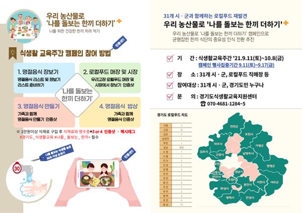 [한국뉴스타임=명기자] 경기도는 31개 시군과 함께 오는 11일부터 10월 18일까지 시군 로컬푸드 직매장, 농협 등에서 ‘나를 돌보는 한 끼 더하기’ 식생활교육 캠페인을 추진한다.