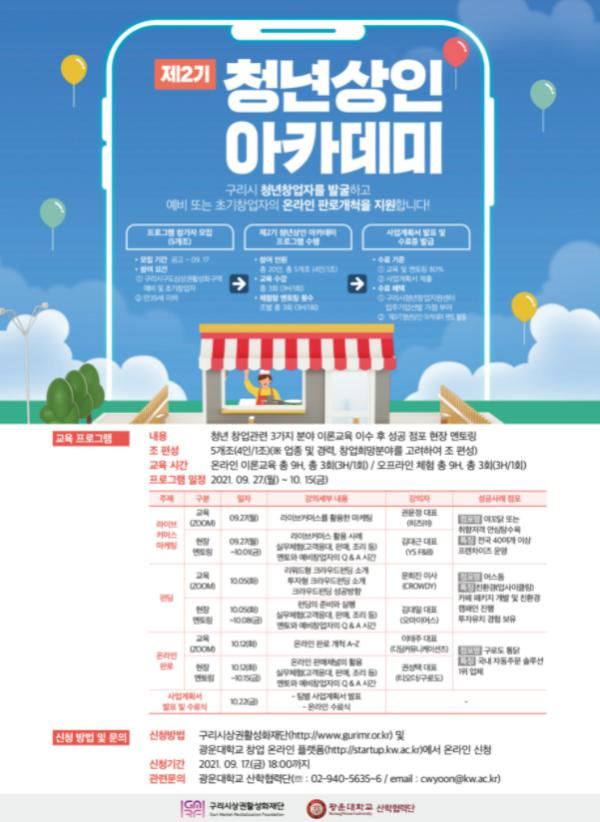 ‘제2회 청년상인아카데미’에 참여하고 싶은 만39세 이하 청년은 오는 9월 17일 18:00까지 구리시상권활성화재단 홈페이지와 광운대학교 창업 온라인 플랫폼을 통해 온라인 신청이 가능하다. 자세한 사항은 구리시상권활성화재단으로 문의하면 된다.