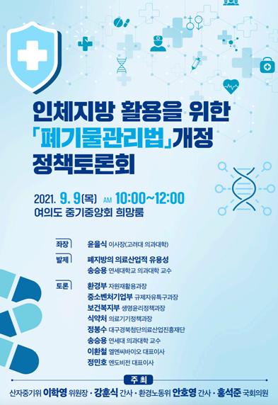 이번 토론회는 국회 산자중기위원장인 이학영 의원의 주도로 여당의 강훈식·안호영 의원과 야당 홍석준 의원 등 4명의 국회의원이 공동주최한다. 강훈식 의원(산자위 간사)과 홍석준 의원은 지난 2월과 3월 인체지방 활용 허용을 위한 「폐기물관리법」일부개정법률안을 각각 대표발의했다. 또한 안호영 의원은 법안의 소관 상임위인 환노위 여당 간사를 맡고 있다.
