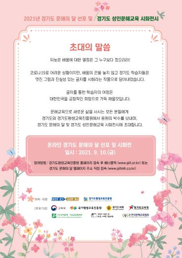 코로나19 확산 방지를 위해 온라인으로 진행되는 올해 ‘경기도 문해의 달’ 선포식은 ▲경기도 문해교육기관 학습자 및 관계자가 직접 영상 공모에 참여해 제작한 ‘경기도 문해의 달 선포영상’ ▲도내 8개 기관의 시화전 수상자들의 인터뷰와 시낭송이 공개된다.