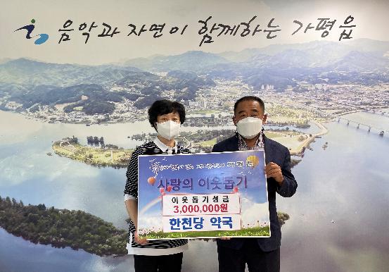[한국뉴스타임=명기자] 가평군은 한천당 약국에서 9월 8일 가평읍행정복지센터 맞춤형복지팀에 관내 저소득층 주민들을 위해 사용해 달라며 사랑의 이웃돕기 성금 300만원을 기탁했다고 밝혔다.