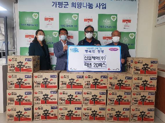 ㈜신일제약은 평소 청평면 저소득층을 위해 파스 및 마스크를 지원해 왔으며, 특히 이번 기탁은 추석을 맞아 코로나로 힘든 청평면 저소득층을 위해 써달라고 라면 20박스를 기탁하며 지속적으로 청평면의 지역복지를 위해 앞장서고 있다.