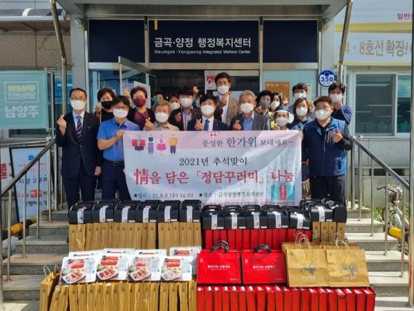 [한국뉴스타임=명기자] 남양주시 금곡양정행정복지센터는 지난 8일 금곡동지역사회보장협의체가 취약계층을 위해 갈비 50세트와 송편 50인분을 후원했다고 밝혔다.
