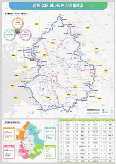 경기 둘레길은 경기도 외곽에 있는 15개 시·군의 기존 걷기여행길을 연결해 약 860km 60개 코스로 조성하는 사업이다. 2018년 11월 기본계획 수립으로 추진돼 올 연말 전 구간 개통을 앞두고 있다. 도는 도민들의 안전하고 친환경적인 걷기 여행을 위해 임도, 제방길 등 위험한 길을 피해 연결하고 자연환경 훼손을 줄이기 위해 안내표지판을 최소화했다.