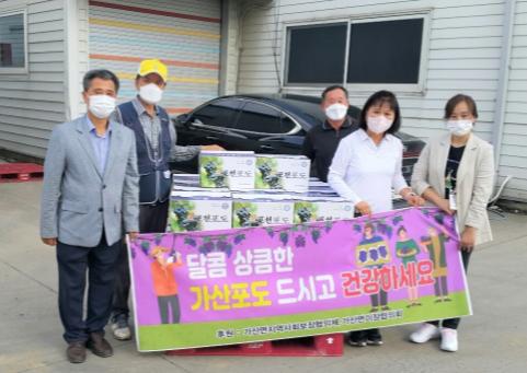 가산면지역사회보장협의체와 이장협의회는 “기탁한 포도는 지역 내 농가에서 생산한 포도로, 지역 농가를 돕고 주변 이웃을 살피고자 기탁하게 되었다.”라며 “탐스럽게 여문 포도알처럼 전달받는 모든분들에게 희망이 가득하길 바란다.”라고 말했다.