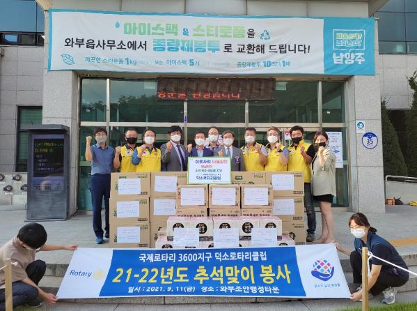 [한국뉴스타임=명기자] 남양주시는 국제로타리 3600지구 덕소로타리클럽에서 추석 명절을 앞두고 지난 10일 소외계층을 위한 두유, 김, 생필품 등의 선물 세트(150만 원 상당)를 와부조안행정복지센터에 전달했다고 밝혔다.