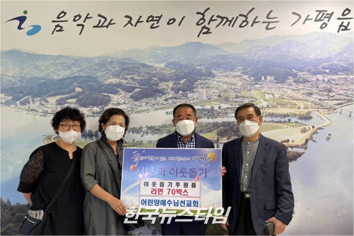 [가평뉴스타임=이명수기자] 14일 가평읍 소재 어린양예수님선교회(권사 김옥자)는 추석을 맞이해 가평읍 행정복지센터에 210만원 상당의 라면 70박스를 불우이웃돕기 물품으로 기탁하였다.