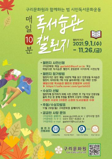 챌린지 참가 방법은 ‘매일 10분 독서습관 챌린지’ 운동본부사이트나 이메일을 통하여 사전 신청 한 후, 매일 10분씩 독서를 하는 과정을 인증샷으로 찍어 11월 26일(금)까지 운동본부사이트에 올려주면 된다. 챌린지 기간 동안 7회 이상(1일 1회 인정) 인증샷을 올린 참가자들에게는 추첨을 통하여 구리문화원장 상과 푸짐한 부상을 수여할 예정이다.