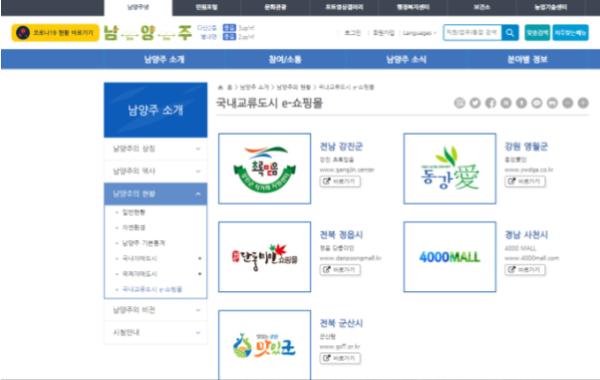 국내 교류도시 e-쇼핑몰은 시 공식 누리집(홈페이지)의 ‘남양주 소개’ 코너 ‘남양주의 현황’에서 확인할 수 있으며, △전남 강진의 ‘초록믿음’ △강원 영월의 ‘동강애(愛)인’ △전북 정읍의 ‘단풍미인’ △경남 사천의 ‘4000몰’ △전북 군산의 ‘군산팜’까지 총 5개 자매도시 대표 브랜드의 농특산물을 직접 구매할 수 있다.