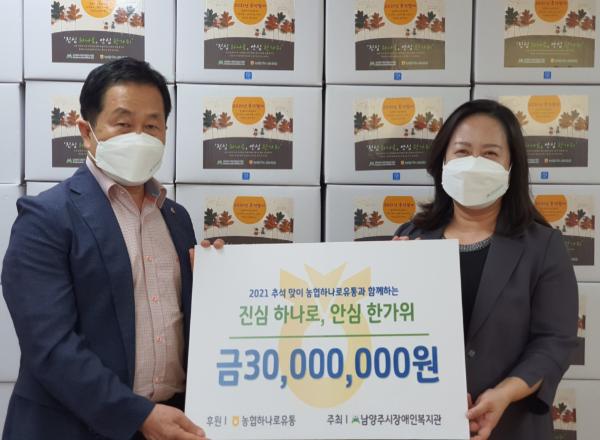 남양주시장애인복지관 운영위원회 김영수 위원장(남양주그린훼밀리운동연합 회장)의 연계로 실시된 이번 나눔은 ‘진심을 판다, 안심을 산다’라는 농협하나로유통의 슬로건처럼 코로나19로 어려운 상황에서도 지역 내 장애인이 행복한 추석을 보낼 수 있도록 진심으로 기원하고, 안전하게 코로나19 상황을 이겨내자는 응원의 마음을 담았다.