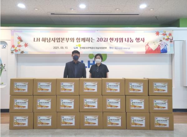 [한국뉴스타임=명기자] 한국토지주택공사 하남사업본부는 하남시종합사회복지관과 추석 명절을 맞아 관내 취약가구 지원을 위한 ‘2021 한가위 나눔 행사’를 15일 실시했다고 말했다.