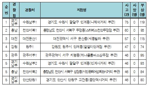 이어 충남 천안시 서북구 두정동(스타벅스천안두정점 부근)에서 60건(부상 93명), 대전광역시 서구 둔상동(세동빌라 부근)에서 57건(부상 115명), 강원도 원주시 단계동(왈왈이단계점 부근)에서 47건(부상 74명), 광주 서구 치평동(케냐콜롬버스상무점 부근)에서 46건(부상 95명)으로 집계되며, 음주운전 교통사고 상위 지역으로 꼽혔다.