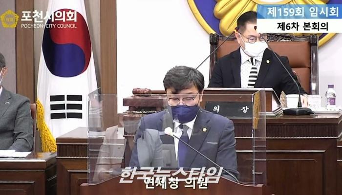 | ( 의사진행발언하는 연제창 시의원 / 출처 : 포천시의회 유튜브 방송 캡처 ) |