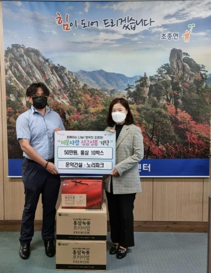 가평군 소재에 있는 운악건설 ․ 노리파크는 9월 16일 조종면행정복지센터를 방문하여 관내 저소득층 주민들을 위해 사용해달라며 홍삼10박스와 성금 50만원을 기탁했다.