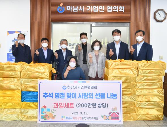 [한국뉴스타임=명기자] 하남시기업인협의회는 지난 15일 코로나19로 어려움을 겪고 있는 소상공인과 지역주민들을 위해 200만원 상당의 과일세트 45상자를 하남시미사강변종합사회복지관에 전달했다.