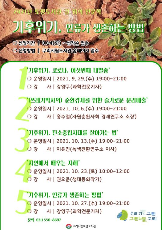 ‘길 위의 인문학’은 문화체육관광부가 주최하고 한국도서관협회가 주관하는 ‘2021년 도서관 길 위의 인문학’ 공모사업에 선정되어 운영하는 사업이다. 이번 프로그램에서는 다양한 주제의 환경 관련 전문가를 초청하여 기후 위기 극복을 위한 탄소 배출 감소, 쓰레기 문제해결에 대한 효과적인 대응 방안을 모색하는 시간을 가질 예정으로, 구리시의 그린뉴딜 슬로건인 「우리家 그린 그린뉴딜, 구리」를 함께 공유하며 집단지성을 발휘할 수 있는 기회가 될 것으로 예상되어 더욱 눈길을 끈다.